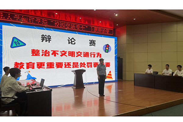 活动还以“整治不文明交通行为教育更重要还是处罚更重要”为主题举办辩论赛,正反方代表引经据典,妙语连珠,从事实入手,将“电动自行车在机动车道上行驶”“骑行电动自行车不戴安全头盔”等诸多实际问题带入辩论观点,紧紧围绕自己的辩题展开论述。辩手们精彩的表现,也让赛场上的同学们通过这次辩论赛更加了解交通安全知识。现场还对校内由学生会、学生社团组建的“校园交警中队”进行授旗,并组织一同前往校内图书馆,通过摆放电动自行车宣传展板、播放宣传片等方式开展电动自行车交通安全宣传。