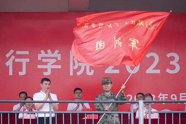 会议最后,党委副书记黄智凌代表学校向军训团授旗。2023级新生为期两周的军训正式拉开帷幕。