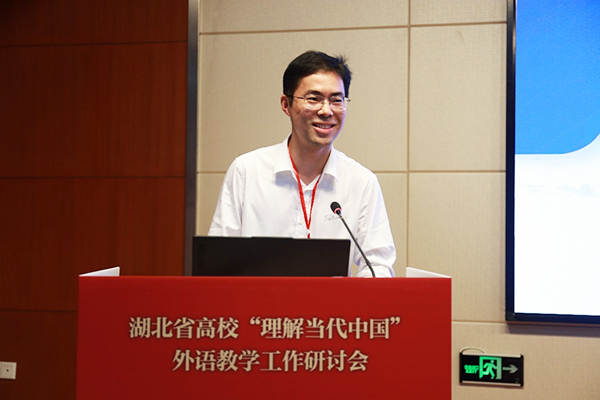本次会议由湖北省教育厅指导,教育部高等学校外国语言文学类专业教学指导委员会、华中师范大学主办,外语教学与研究出版社承办。会议课程示范环节中,湖北大学、湖北师范大学、武汉纺织大学、荆楚理工学院和我校外国语学院副院长林名仲等多所高校院长和骨干教师分别就各校在基于《理解当代中国》多语种系列教材开展课程建设和课程体系建设、教学方法和手段创新、落实“三进”工作的特色做法进行了交流和分享。林名仲代表学校作了“独立学院‘理解’系列课程建设探微——以湖北大学知行学院为例”的经验交流发言。