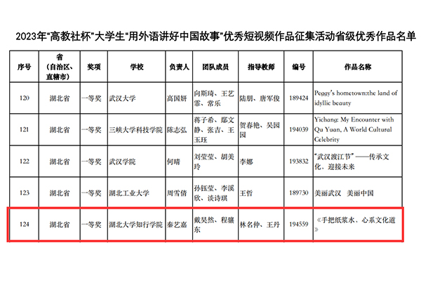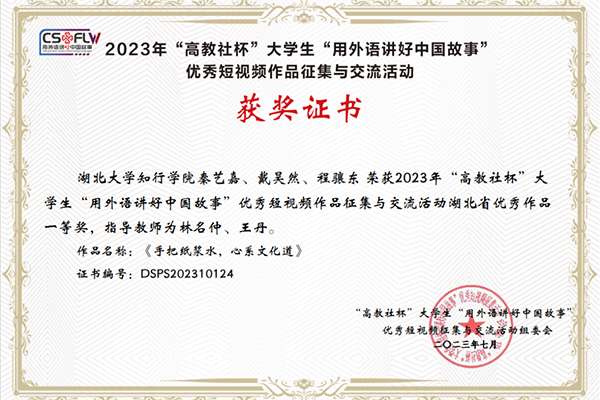 近日,2023年“高教社杯”大学生“用外语讲好中国故事”优秀短视频作品征集活动省赛成绩揭晓,我校推送的两部作品全部入围省级竞赛,其中由外国语学院林名仲、王丹老师指导,外国学院秦艺嘉、戴昊然、王丹枫,人文学院程骧东等同学共同创作的作品《手把纸浆水,心系文化道》在全省作品中脱颖而出,荣获湖北省一等奖。