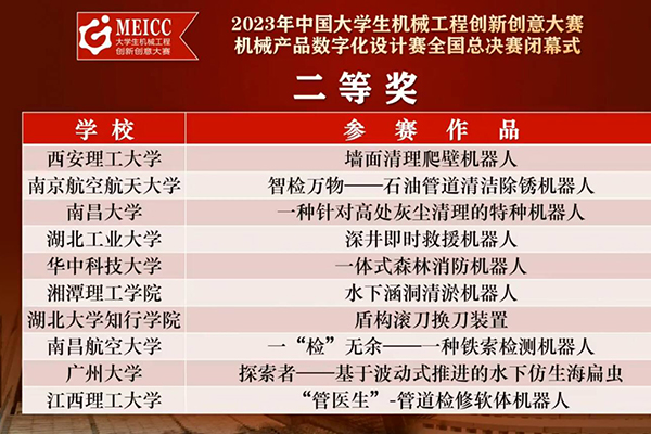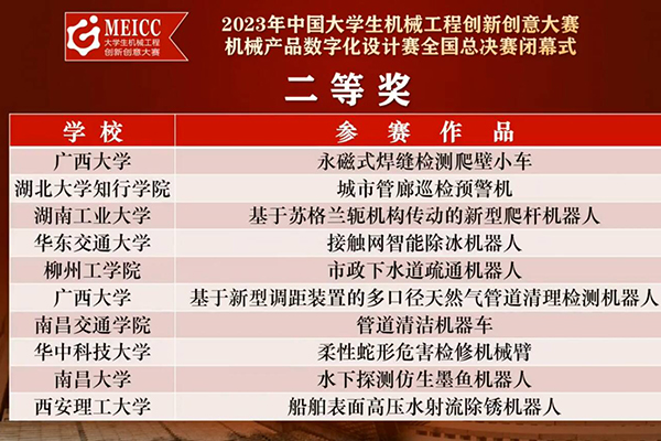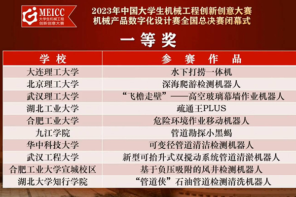 11月18日至19日,2023年中国大学生机械工程创新创意大赛创意赛道(全国总决赛)在华中科技大学举行,知行学子在比赛中喜获佳绩,其中,何贤伟、李枳尧、刘娜三名同学的作品《“管道侠”石油管道检测清洗机器人》荣获全国一等奖,朱海鹏、文习桓、张勇康三名同学的作品《城市管廊巡检预警机》和谢梓俊、周彧、涂校鹏三名同学的作品《盾构滚刀换刀装置》荣获全国二等奖。