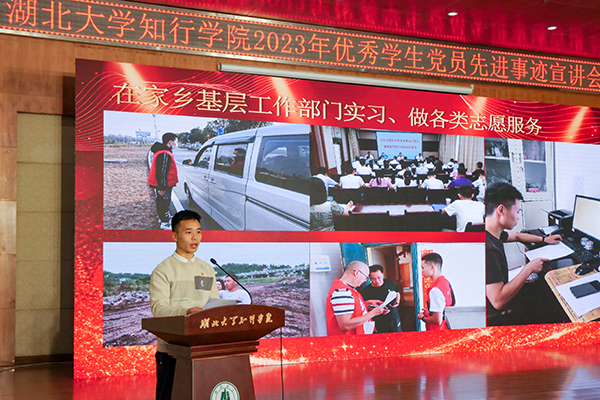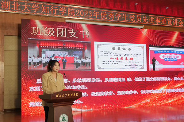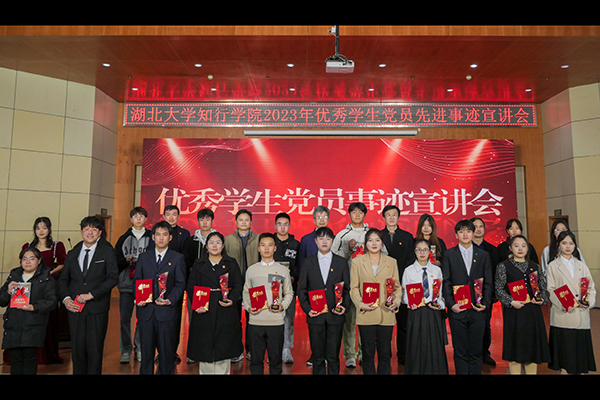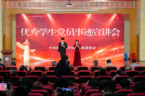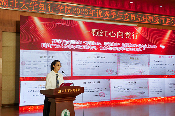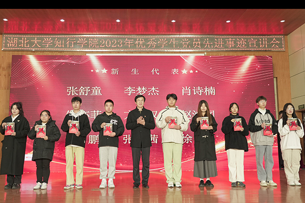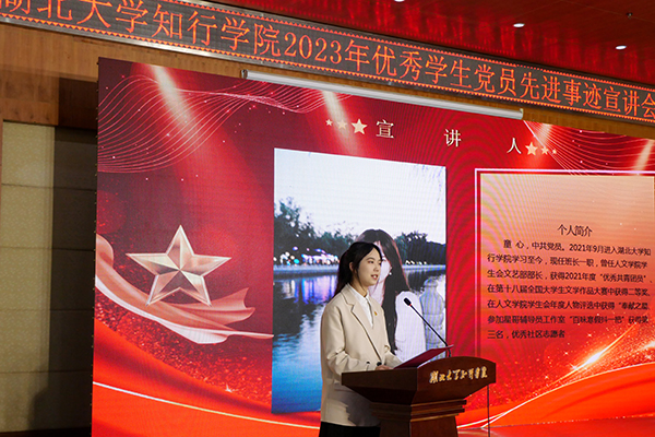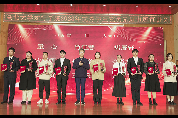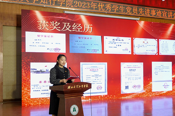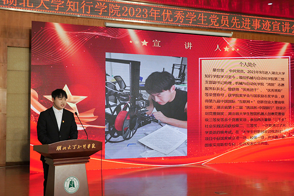 党委副书记黄智凌在讲话中对九位优秀学生党员代表给予了充分肯定。他指出,先进事迹宣讲既是对在校优秀大学生党员努力拼搏、取得优异成绩的充分肯定和高度赞誉,更是以知行优秀学生榜样的力量激励广大在校生筑梦知行、勇毅前行的一次思想洗礼和精神鼓舞,希望同学们学习身边的好榜样,践行“厚德载物,认知践行”的校训,坚实理想信念,积极追求进步,不负青春韶华,用青春书写无愧于时代、无愧于历史的华彩篇章。
