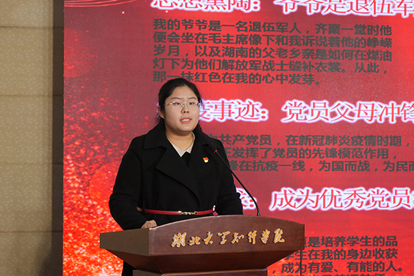 宣讲会上,九个二级学院的优秀学生党员代表童心、肖佳慧、褚辰轩、宋姗娜、徐成焱、龚徐娜、晏世贸、王雨溪、周凯文分别结合自身的学习及实践经历,从入党动机、学习收获以及党员身份带给自己的转变谈起,讲述了自己对党的认识和对大学生活的独特感悟和理解。他们积极参加社会实践,升华理论知识,在服务中体现大学生的责任与担当;他们立足校园,积极参加志愿活动,在奉献中体现个人价值;他们发挥集体意识,带领组织成员努力完成各项工作任务,并取得了显著成绩;他们用坚毅的品格在平凡的班级岗位超越自我,用勤奋证明“只争朝夕,不负韶华”的坚毅与初心。优秀学生党员的感人事迹为大家上了一堂深刻的思政课,引起参会师生的强烈共鸣,全场气氛热烈、掌声不断。