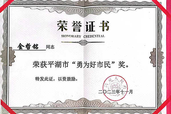 知行学子荣获浙江省平湖市“勇为好市民”荣誉