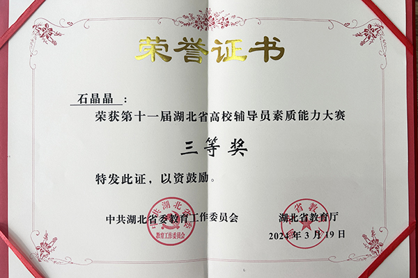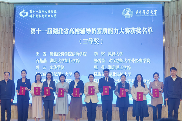 3月19日,第十一届湖北省高校辅导员素质能力大赛在华中科技大学落下帷幕,我校机械与自动化学院辅导员石晶晶荣获大赛三等奖。本次奖项的获得是对我校辅导员工作的一次全面检验,更是对我校思想政治教育工作的一次有力展示。