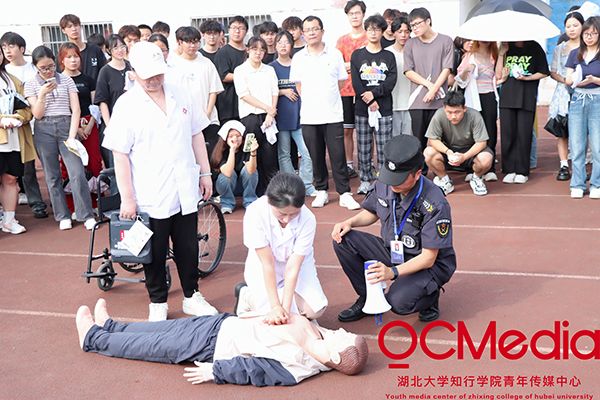 实战演练中,师生代表前往南苑四号学生公寓现场观摩参与。演练活动模拟学生公寓三楼发生火险,学生安全员迅速会同公寓管理员初步判断火情后向保卫处报告,保卫处及时上报火险,消防安全员及安保人员迅速到位,开展初期火险扑救工作,同时指挥学生有序撤离学生公寓。区消防应急救援大队消防人员到场后开展灭火和救助工作。学生安全撤离到运动场后,校医院工作人员现场演示了灾害受伤人员的创伤应急处置,紧急胸外按压救助流程等实操知识。