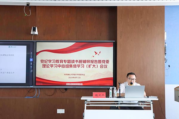 6月12日下午,学校在知真楼418室举行党纪学习教育专题读书班辅导报告暨党委理论学习中心组集体学习(扩大)会议,党委书记彭德忠主持学习。湖北大学纪委、监察专员办公室纪检监察室主任魏文杰应邀为党员干部解读《中国共产党纪律处分条例》(以下简称《条例》)。全体校领导、中层干部和各党总支、直属党支部支部委员参加学习。