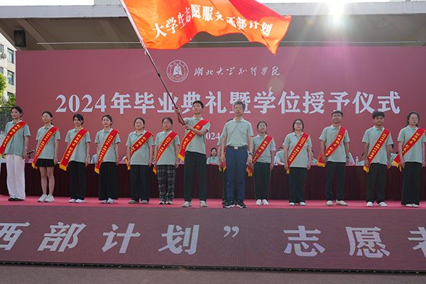 典礼现场,学校举行了2024年西部计划志愿者出征仪式,党委书记彭德忠为20名学生一一授予“到西部去、到基层去、到祖国最需要的地方去”的绶带,勉励他们努力拼搏,让青春之花绽放在祖国需要的地方。彭德忠还为学生代表授旗,现场响起阵阵掌声。