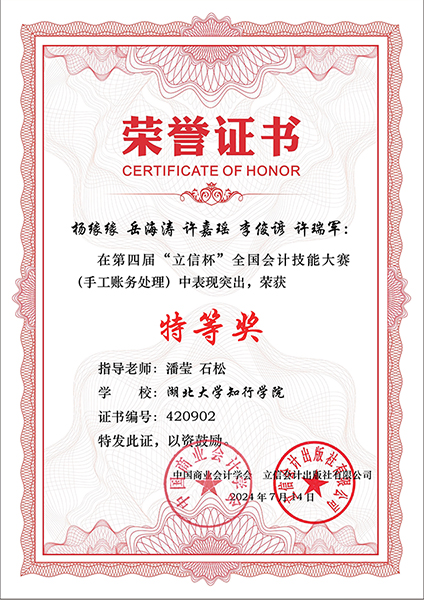 近日,2024年第四届“立信杯”全国大学生会计技能大赛落下帷幕。我校会计学院5支参赛队伍共获得特等奖1项、一等奖2项、优胜奖2项,5支队伍全部获评“网络人气奖”,学校同时荣获最佳组织奖。石松、潘莹两位老师荣获优秀指导教师奖。