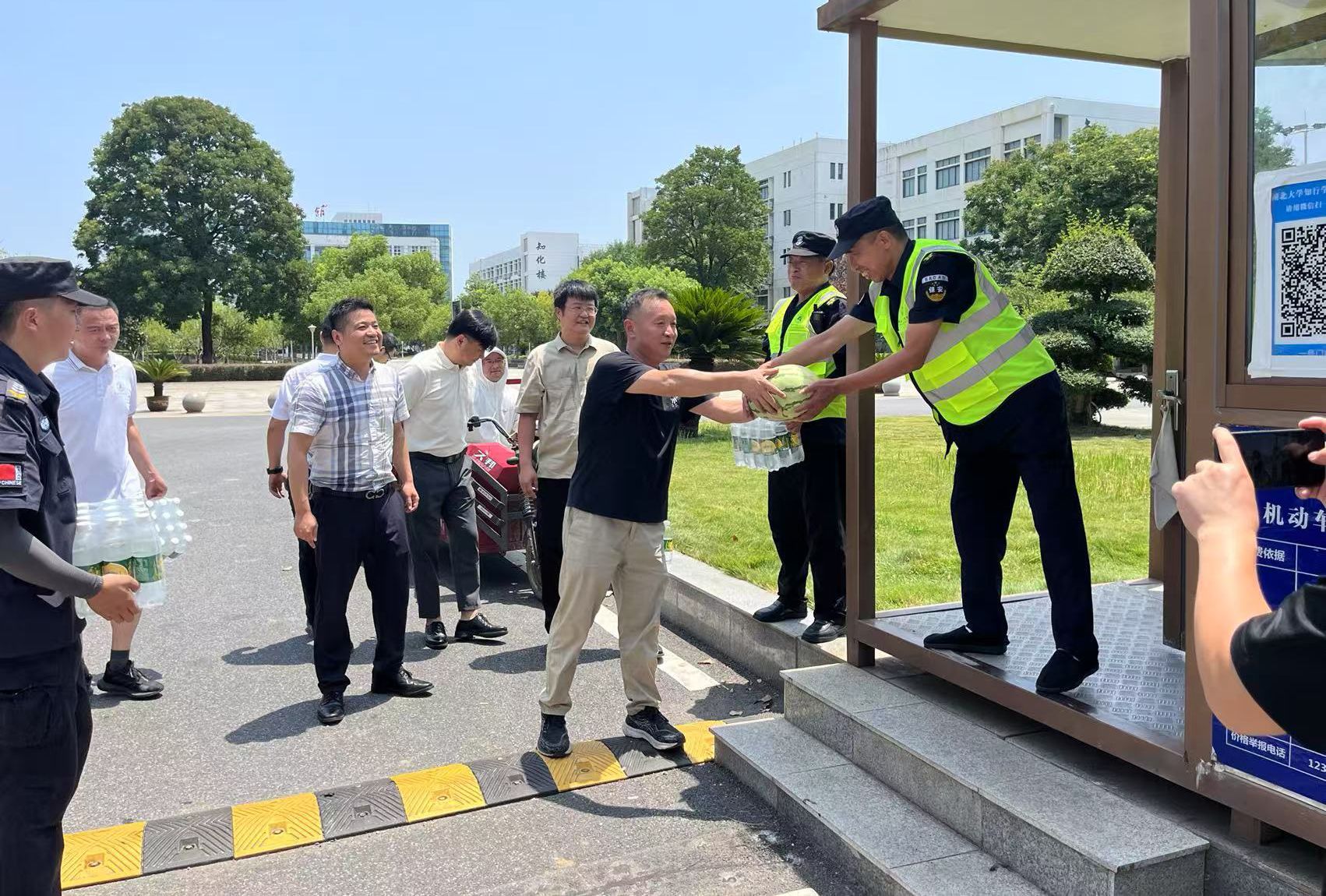 连日来,江城武汉持续高温天气。7月16日,院长何顺进深入一线,看望慰问在暑期坚守岗位的教职工和后勤服务人员,为他们送去防暑降温的慰问品,代表学校向他们致以问候和敬意。副院长刘齐及相关职能部门负责人参加慰问。