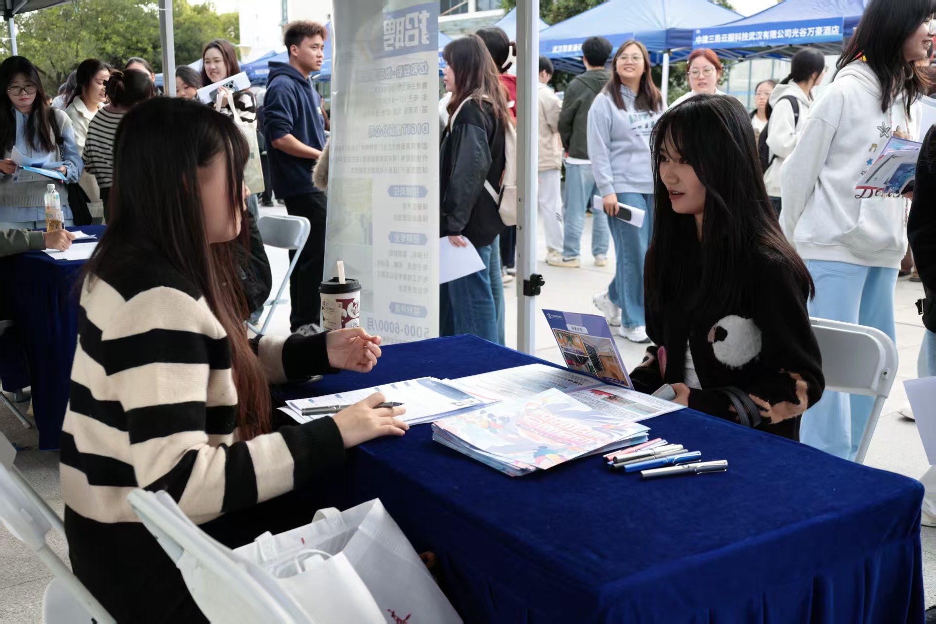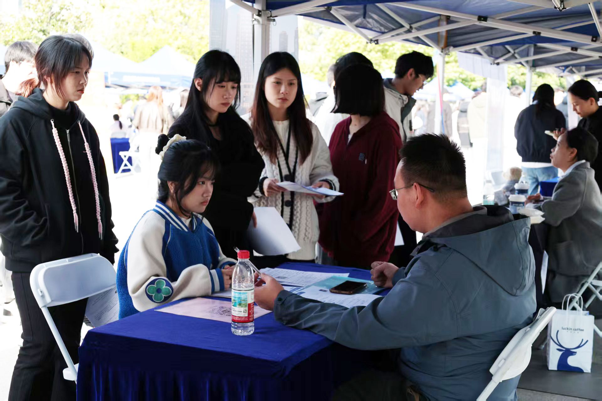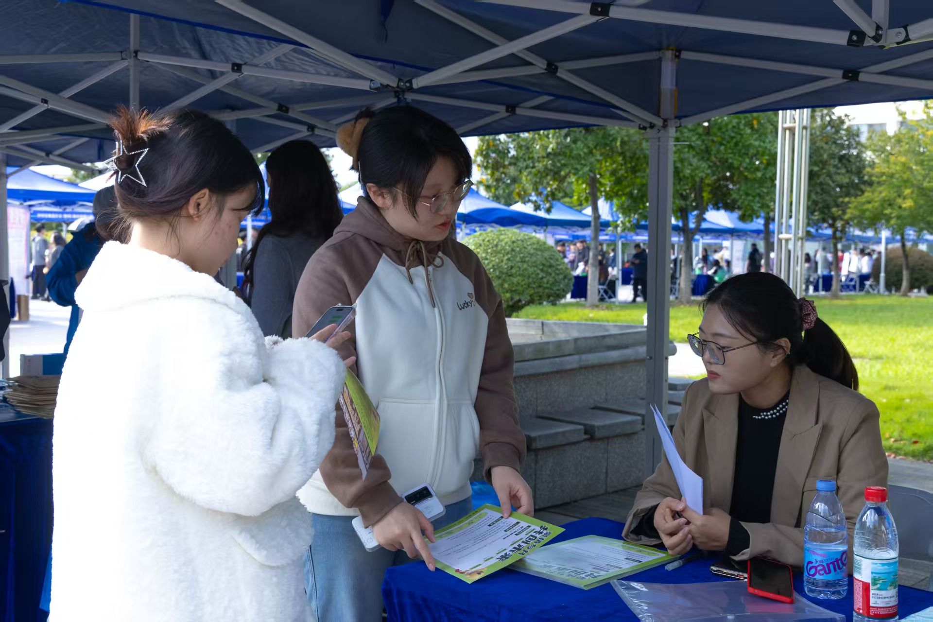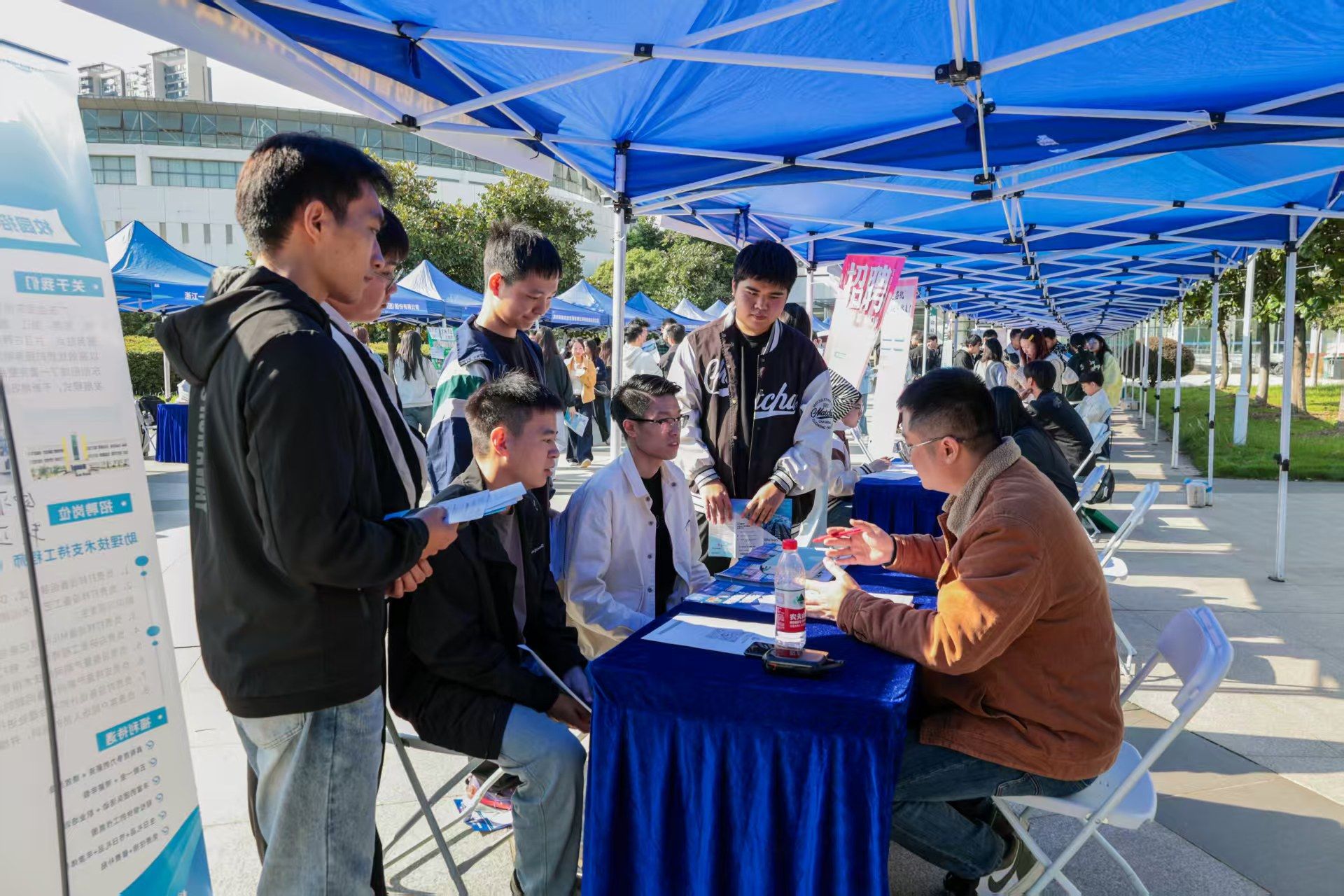 在双选会现场,大学生就业创业指导服务中心专门设立了咨询服务区,为学生解答各类政策问题,并提供简历优化、面试指导与签约流程答疑等贴心服务,帮助学生更好地应对求职挑战。