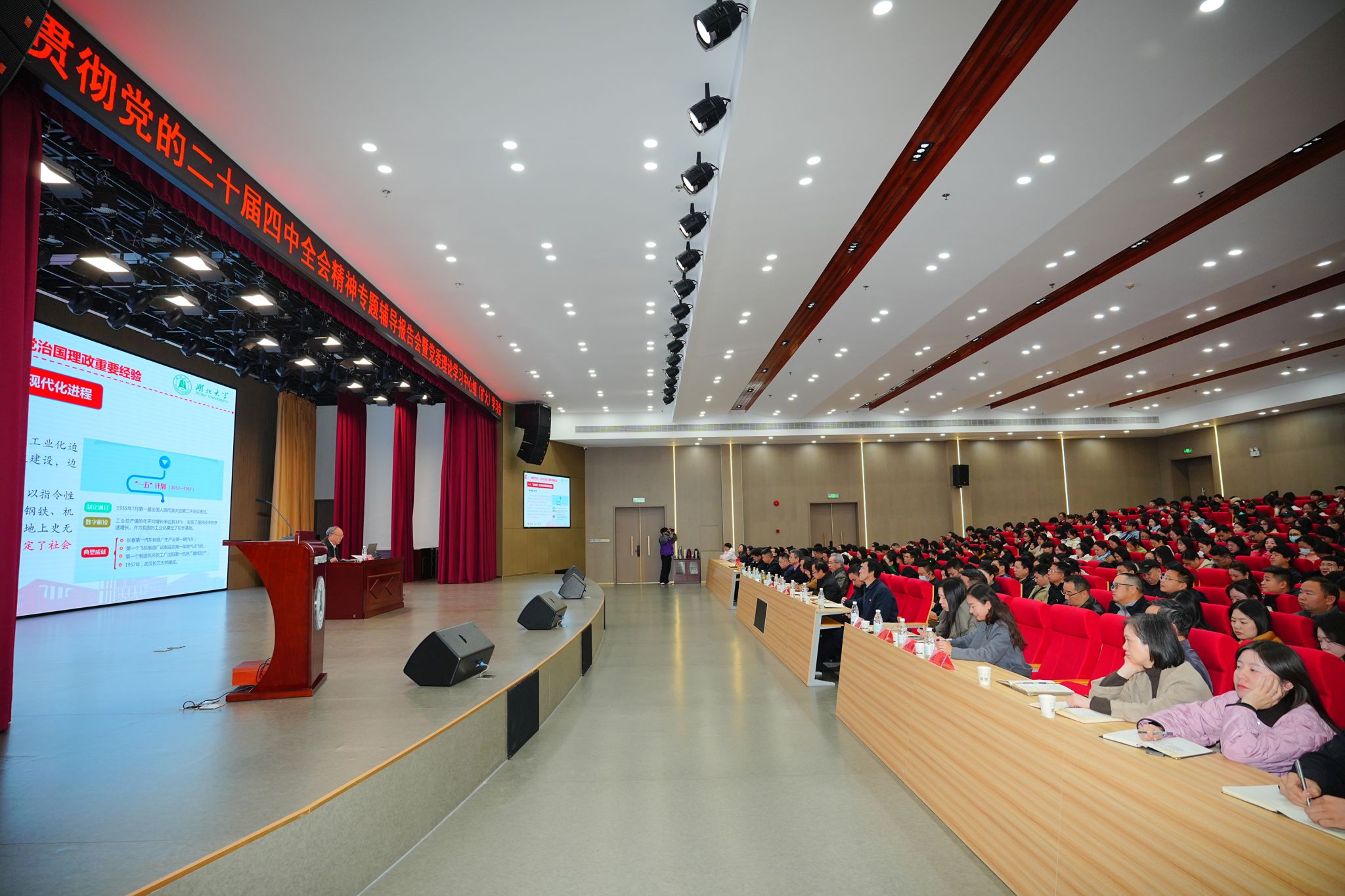 讲解中,谢红星紧紧围绕习近平总书记在党的二十届四中全会上的重要讲话精神和全会《建议》,从深刻认识制定实施五年规划是党治国理政重要经验,准确把握“十五五”时期在基本实现社会主义现代化进程中的重要地位,深刻领会“十五五”时期经济社会发展的指导方针、主要目标、战略任务、重大举措、根本保证等方面,对全会精神作了全面宣讲和系统阐释。并结合全会《建议》的战略部署,深入分析了高等教育和湖北大学“十四五”改革发展的重大成就、宝贵经验以及“十五五”面临的形势任务。
