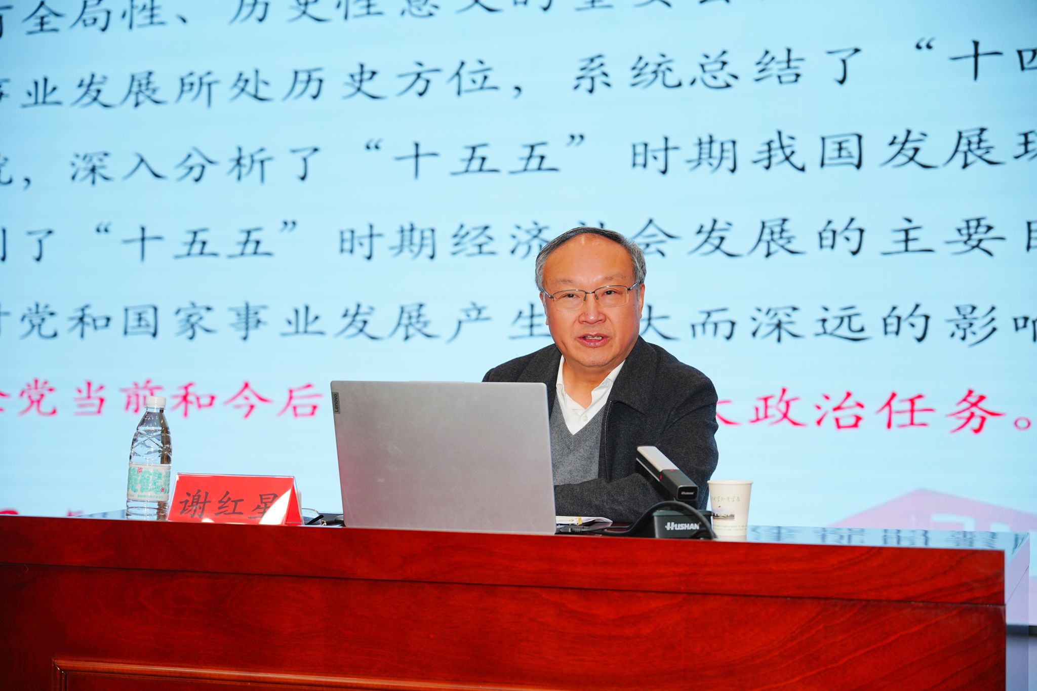 报告中,谢红星以《续写“两大奇迹”新篇章 开创中国式现代化建设新局面》为题,从“读懂制度优势:五年规划是党治国理政重要经验”“把握战略部署:党的二十届四中全会的主要内容”“引领强国建设:高等教育改革发展的形势与任务”等三个方面进行了全面讲解辅导。