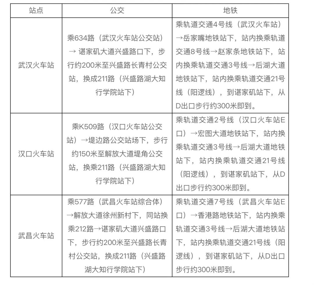 9月16日早7:00—晚17:00,学校在武汉火车站、武昌火车站、汉口火车站设立迎新接待站。(温馨提醒:我校迎新工作人员均佩戴有学校迎新工作证,不会向家长和学生收取任何费用、推荐任何服务和产品,请家长和新生注意个人财产安全)
