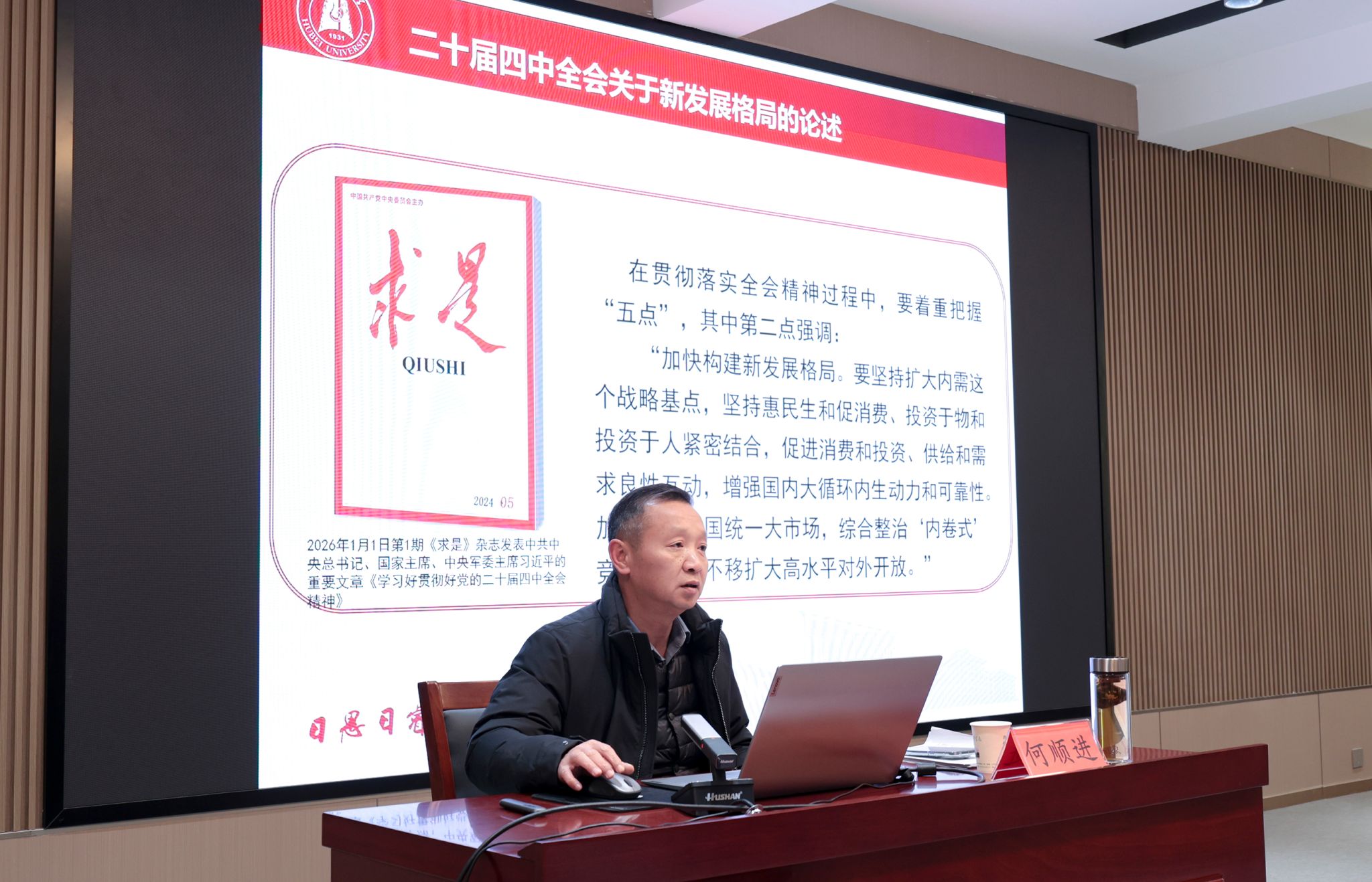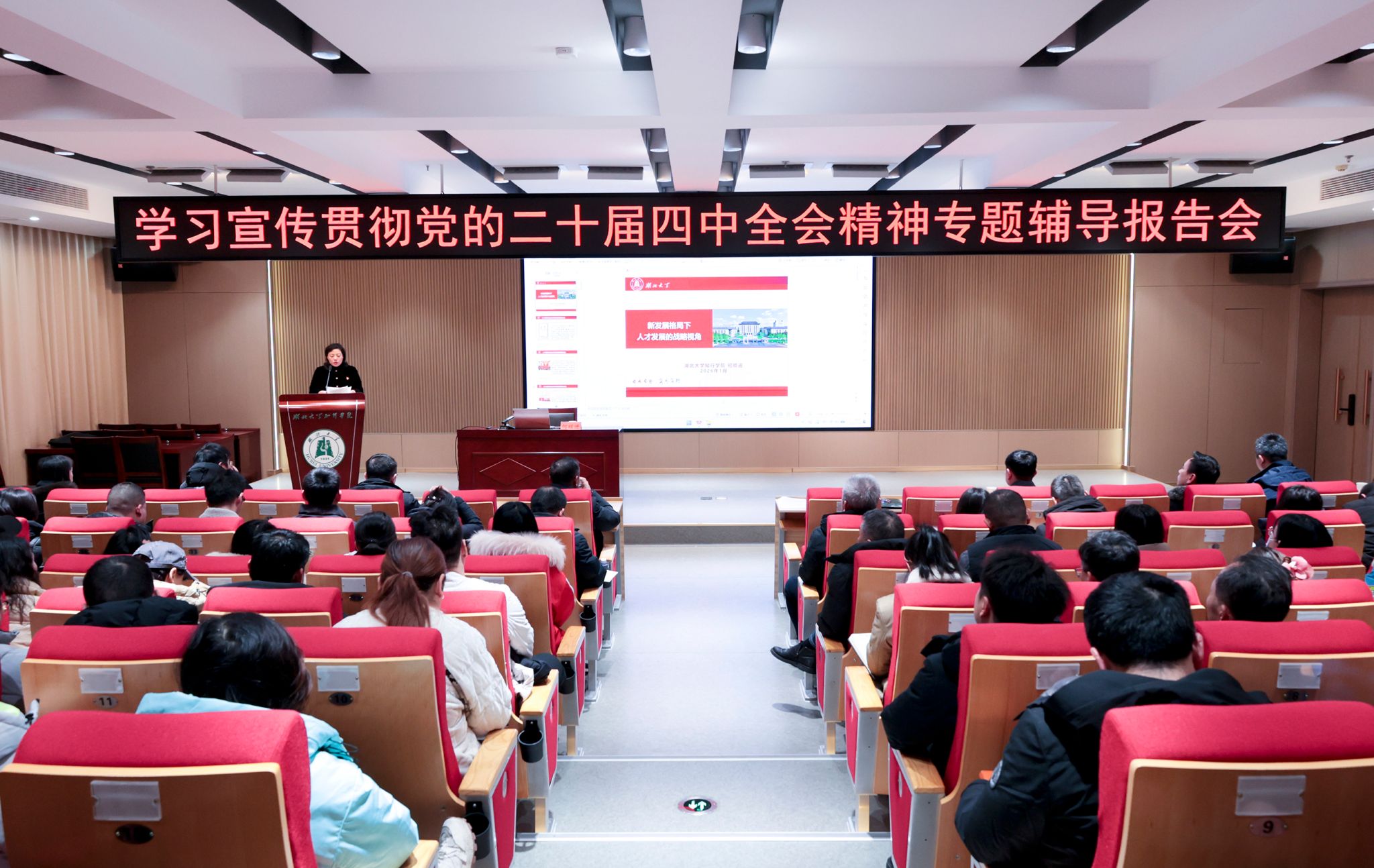 1月20日下午,学校在知远楼弘智厅举行学习宣传贯彻党的二十届四中全会精神辅导报告会暨党委理论学习中心组(扩大)2026年第2次集体学习。党委书记金梅主持会议。学习宣传贯彻党的二十届四中全会精神湖北大学宣讲团成员、院长何顺进作专题辅导报告。全体校领导,全体中层干部,各党总支、直属党支部委员,全体辅导员参加学习。